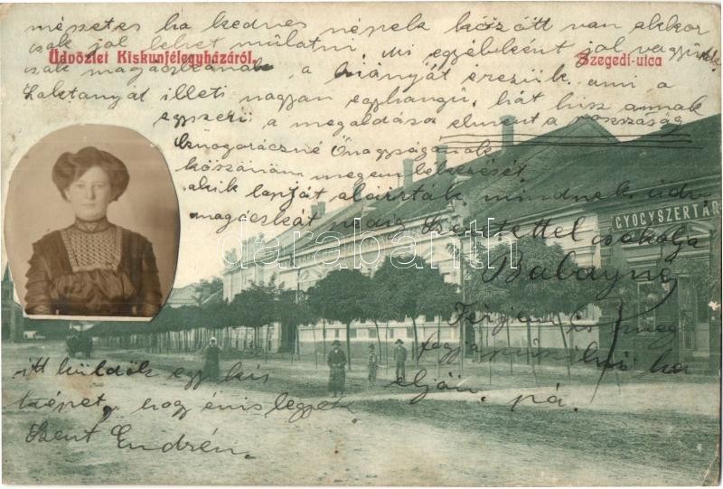 Leírás: 1911 Kiskunfélegyháza, Szegedi utca, Gyógyszertár, kerékpár, utcakép. Kiadja Royko B. 230. A levél írójának ráragasztott portréjával (EK)