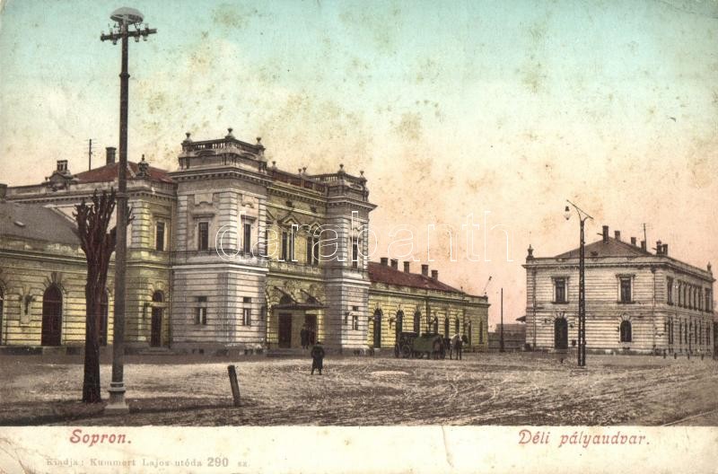 Leírás: 1911 Sopron, Déli pályaudvar, Vasútállomás, lovaskocsi. Kiadja Kummert Lajos utóda 290. sz. (fl)