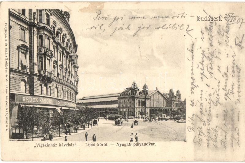 Leírás: 1929 Budapest XIII. Brück Károly Vígszínház Kávéháza, Lipót körút, Nyugati pályaudvar, villamos