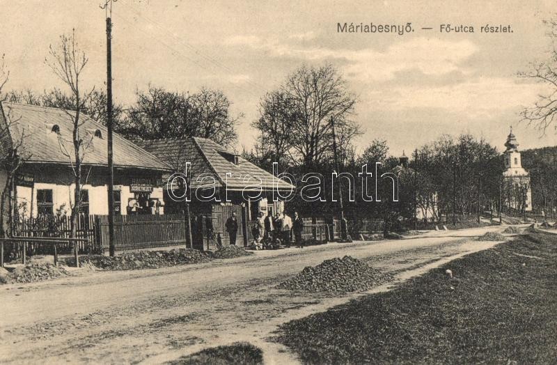 Leírás: 1929 Máriabesnyő (Gödöllő), Fő utca, Hangya Szövetkezet üzlete, templom