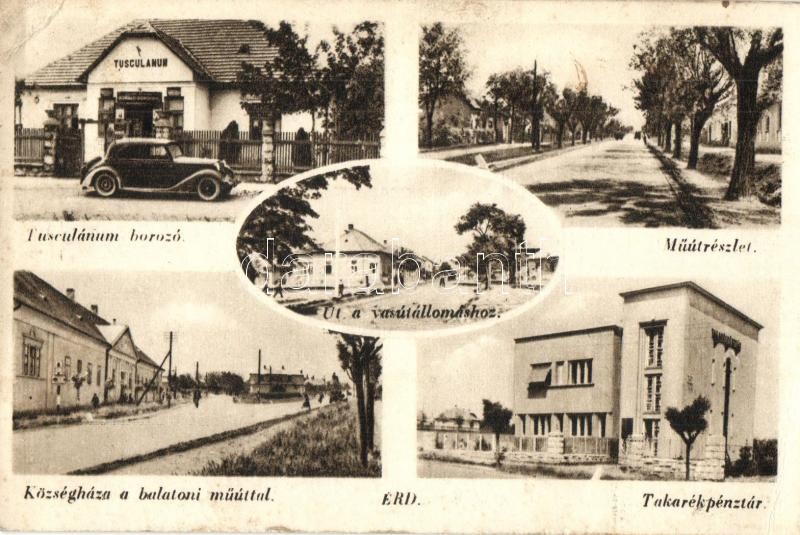 Leírás: 1943 Érd, út a vasútállomáshoz, Műút részlete, takarékpénztár, községháza a Balatoni műúttal, Tusculanum borozó automobillal (EK)