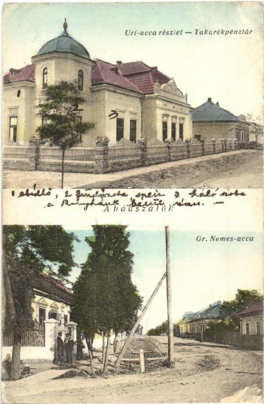 Leírás: Abádszalók, Úri utca, kúria, takarékpénztár, Gr. Nemes utca, gyógyszertár