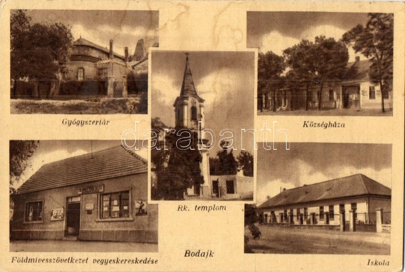 Leírás: Bodajk, Gyógyszertár, Római katolikus templom, Községháza, Földmívesszövetkezet üzlete, Iskola (fl)