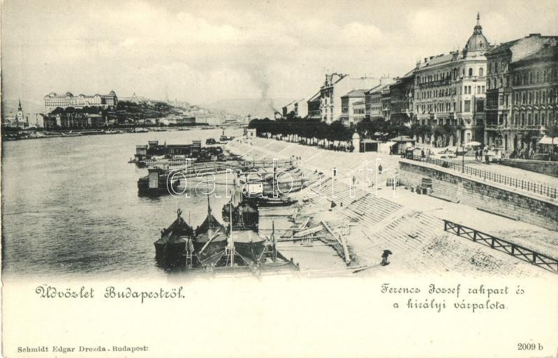Budapest V. Ferenc József rakpart és a királyi vár, hajó kikötő. Kiadj... https://www.darabanth.com/hu/342-Gyorsarveres/342.0/Kepeslapok/Magyarorszag~2000004/Budapest-V-Ferenc-Jozsef-rakpart-es-a-kiralyi-var-hajo-kikoto-Kiadja-Schmidt-Edgar~II1930820