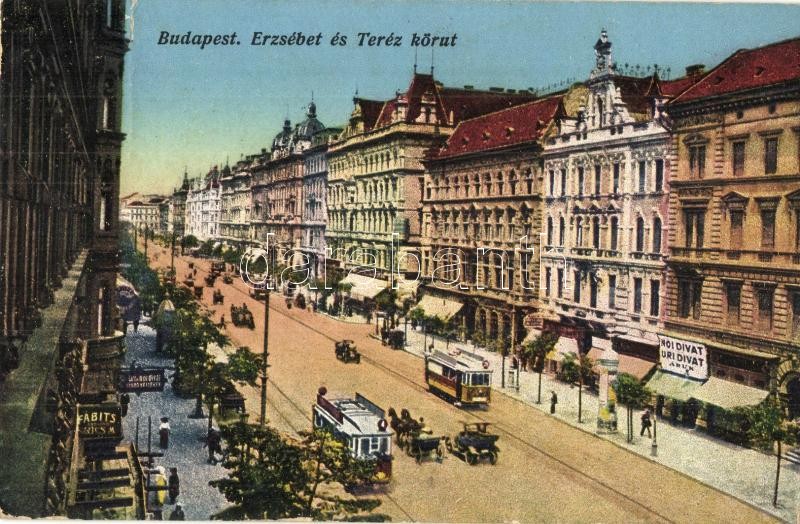 Leírás: Budapest VII. Erzsébet és Teréz körút, villamosok, Fábits, Szűcs M. üzlete. Erdélyi udv. fényképész felvétele (szakadás / tear)