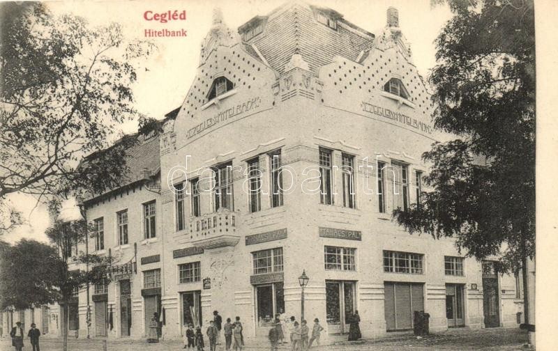 Leírás: Cegléd, Hitelbank, Polgár és Radó, Takács Pál, Szabó Gyula és fia üzlete