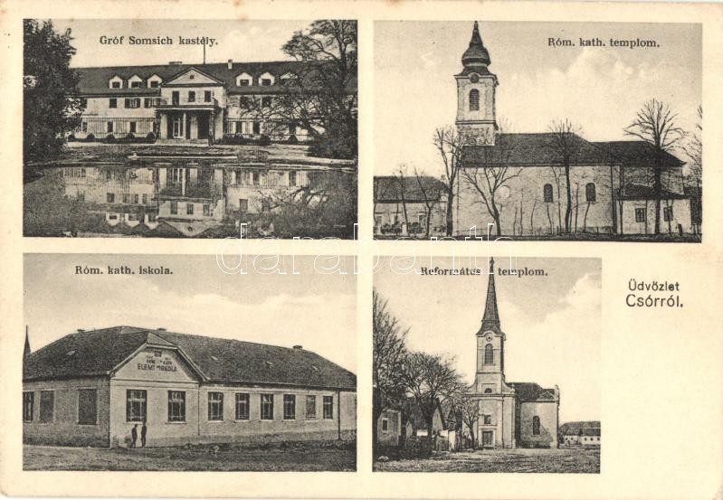 Leírás: Csór, Csoór; Somssich kastély, Római katolikus templom és iskola, Református templom (EK)