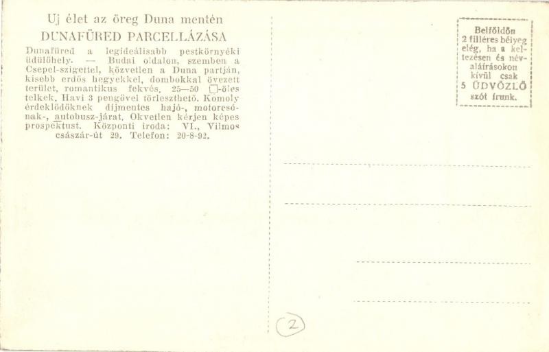 Leírás: Dunafüred, hajóállomás, érkezés gőzhajóval. Hátoldalon reklám Dunafüred Parcellázásáról (EK)