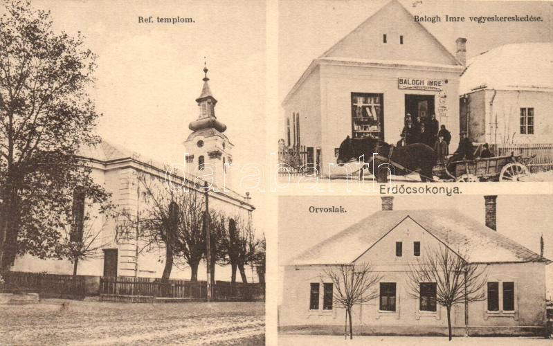Leírás: Erdőcsokonya (Csokonyavisonta), téli képek, református templom, orvoslak, Balogh Imre vegyeskereskedése és saját kiadása