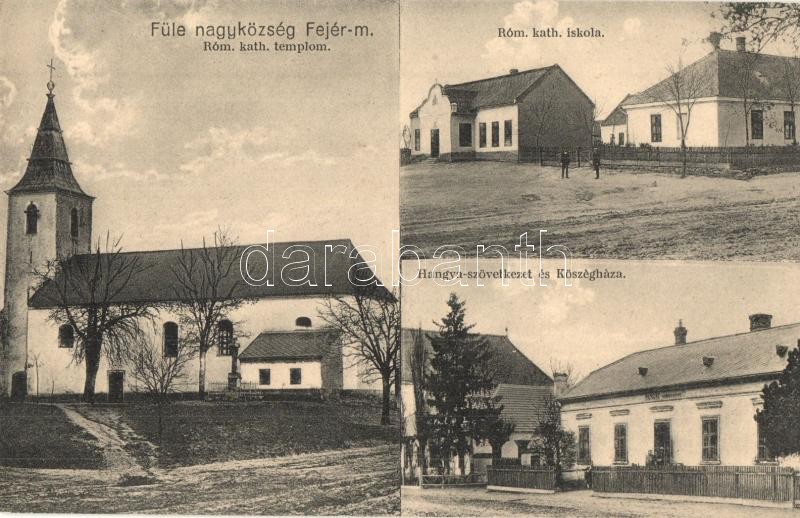 Leírás: Füle, Római katolikus templom és iskola, Községháza, Hangya Szövetkezet üzlete (EK)
