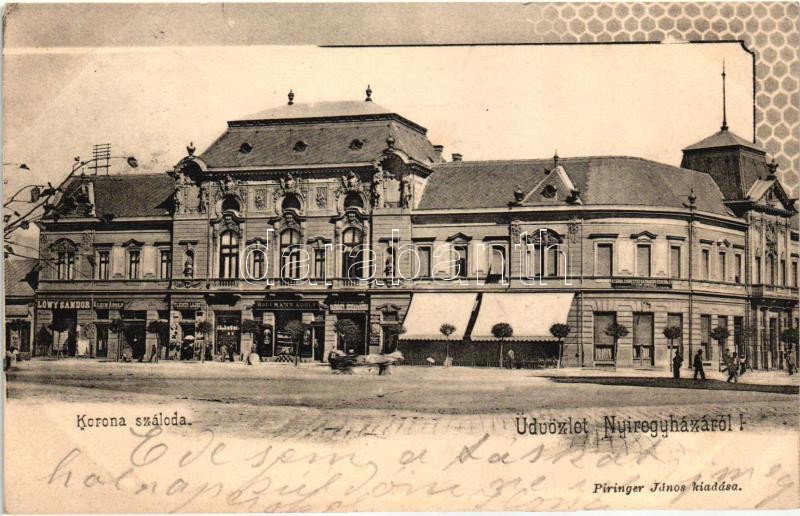 NyÃregyháza, Korona szálloda, LÅ‘wy Sándor, Klein Adolf, Fleimer Lajos, Hoffmann Adolf üzletei, Szabolcs megyei Gazdasági Egyesület titkári hivatala, ElsÅ‘ magyar varrógép- és kerékpárgyár rt. képviselete. Piringer János kiadása