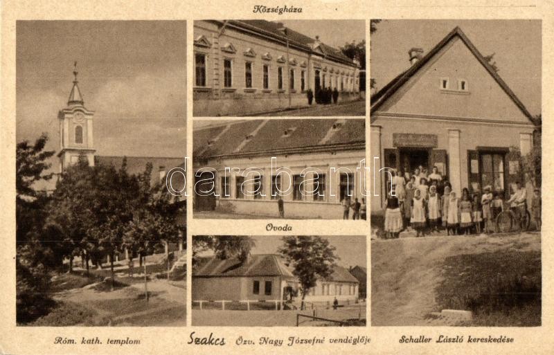 Leírás: Szakcs, Római katolikus templom, Községháza, Óvoda, Özv. Nagy Józsefné vendéglője, étterem, Schaller László üzlete, kerékpár