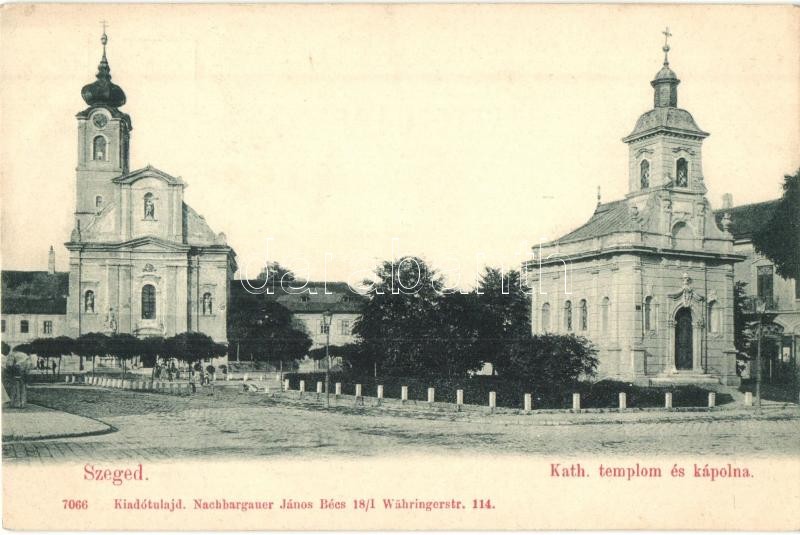Szeged, Katolikus templom és kápolna. Nachbargauer János kiadása 7066. https://www.darabanth.com/hu/342-Gyorsarveres/342.0/Kepeslapok/Magyarorszag~2000004/Szeged-Katolikus-templom-es-kapolna-Nachbargauer-Janos-kiadasa-7066~II1930037