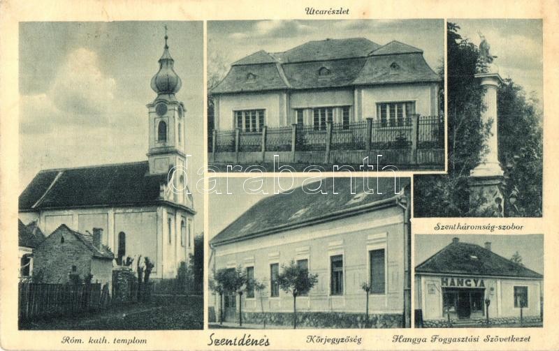 Leírás: Szentdénes, Római katolikus templom, Körjegyzőség, kastély, utcakép, Szentháromság szobor, Hangya Fogyasztási Szövetkezet üzlete (EK)