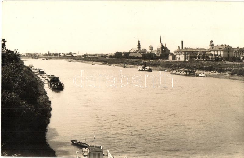 Leírás: Szolnok, Tiszapart, uszályok, gőzhajó, templomok, izraelita templom, zsinagóga. Bánó Ernő photo