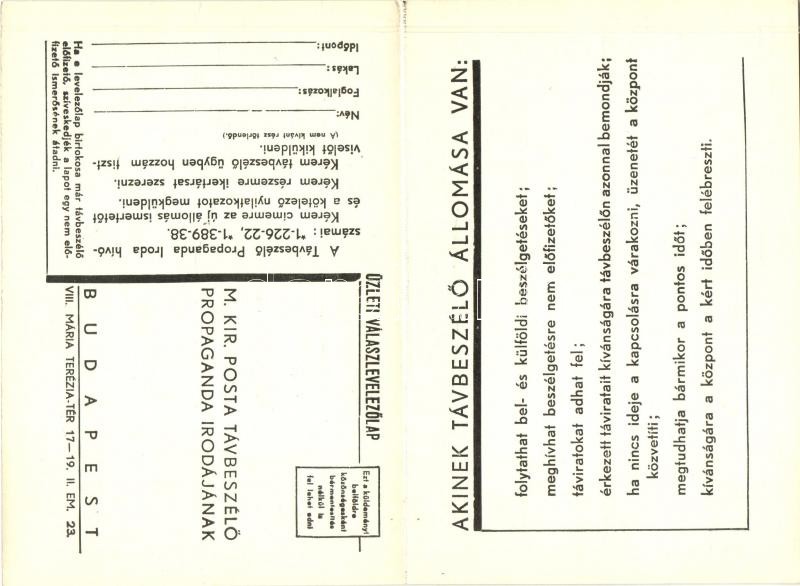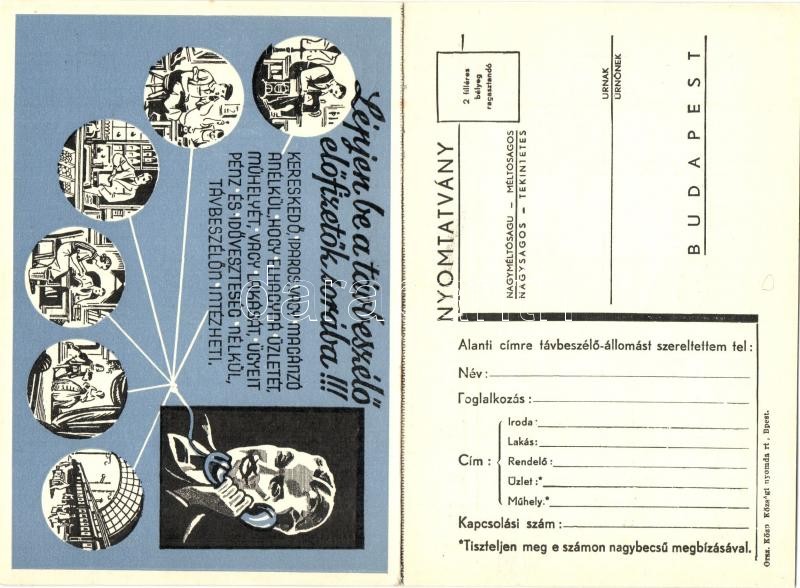 Lépjen be a távbeszélő előfizetők sorába! A Magyar Királyi Posta Távbeszélő Propaganda Irodájának reklámlapja és válaszlapja kihajtható képeslapon / advertisement postcard of the Hungarian Royal Post's Phone Propaganda Office, foldable card