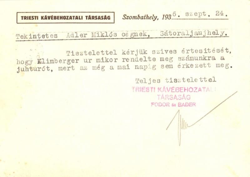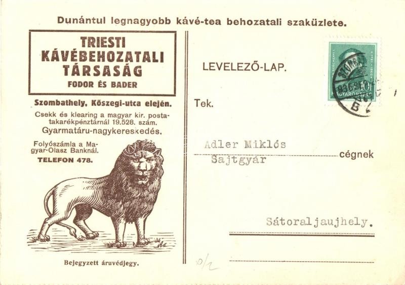 Triesti Kávébehozatali Társaság (Fodor és Bader) Szombathely, Kőszegi ... https://www.darabanth.com/hu/342-Gyorsarveres/342.0/Kepeslapok/Reklam~2000061/Triesti-Kavebehozatali-Tarsasag-Fodor-es-Bader-Szombathely-Koszegi-utca-Hungarian-coffee-~II1927291