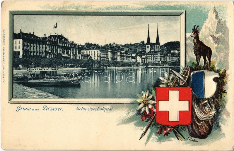 Leírás: Lucerne, Luzern; Schweizerhofquai, Bateaux a Louer / quay, boat. coat of arms, K. Liebhardt Kunstanstalt Emb. litho (EK)