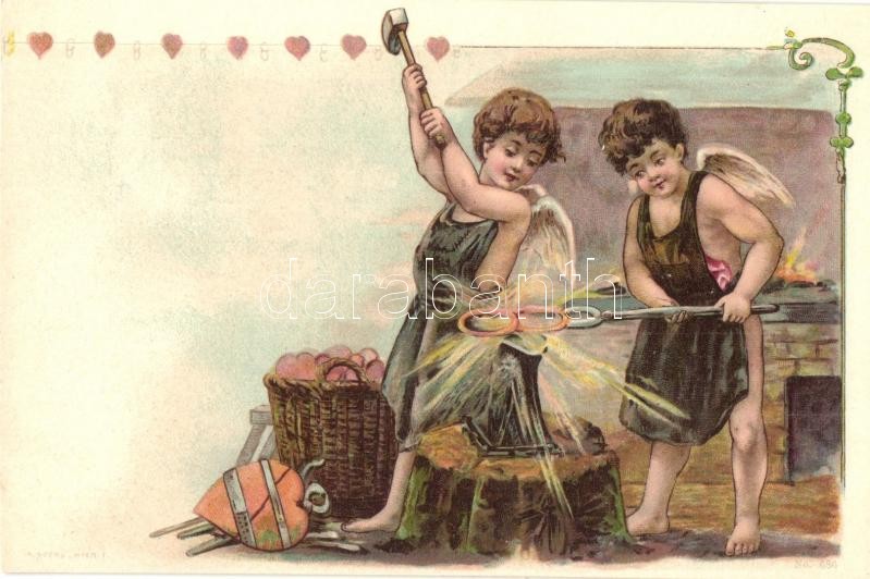 Love greeting art postcard with blacksmith angels. A. Sockl Wien litho https://www.darabanth.com/hu/342-Gyorsarveres/342.0/Kepeslapok/Udvozlolapok-Unnepek~2000069/Love-greeting-art-postcard-with-blacksmith-angels-A-Sockl-Wien-litho~II1931584