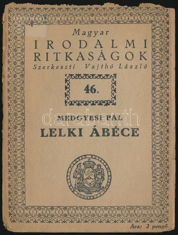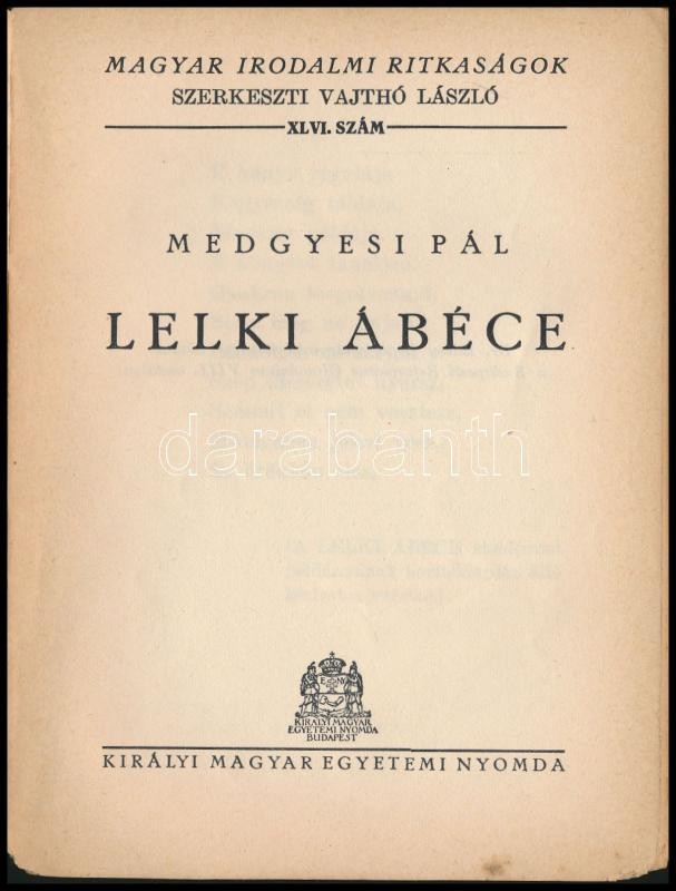 Medgyesi Pál: Lelki ábéce. Magyar Irodalmi Ritkaságok 46. sz. Bp.,(1940), Királyi Magyar Egyetemi Nyomda. Kiadói papírkötés, a borítója leszakadt, a gerince hiányos, az utolsó négy lap elvált a könyvtesttől.