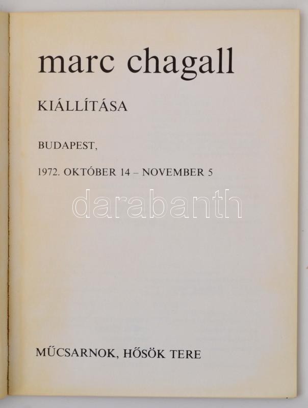 Marc Chagall kiállítási katalógus. Bp., 1972, Műcsarnok. Fekete-fehér ... https://www.darabanth.com/hu/342-Gyorsarveres/342.0/Konyvek/Konyvek-Epiteszet-muveszet~1000006/Marc-Chagall-kiallitasi-katalogus-Bp-1972-Mucsarnok-Fekete-feher-illusztraciokkal-Kiad~II1902619