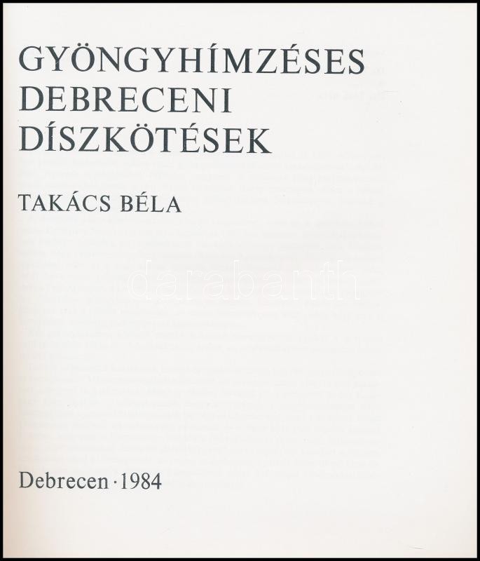 Takács Béla: Gyöngyhímzéses debreceni díszkötések. Debrecen, 1984, Közgazdasági és Jogi Könyvkiadó. Kiadói egészvászon kötés, szakadt papír védőborítóval, jó állapotban.