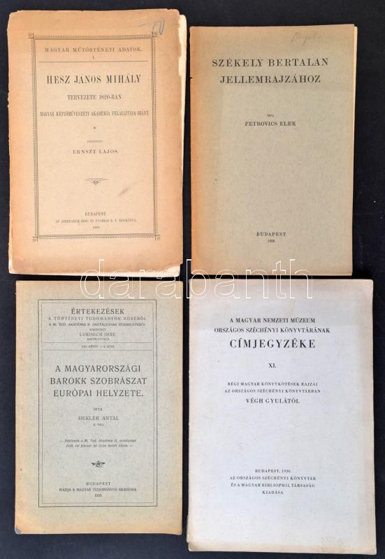 Vegyes könyvtétel, 4 db: Petrovics Elek: Székely Bertalan jellemrajza. Bp.,1936, Franklin, 30 p. Kiadói szakadt papírkötésben. Hekler Antal: A magyarországi barokk szobrászat európai helyzete. Értekezések a Történeti Tudományok Köréből. XXV. kötet. - 5. sz. Bp.,1935, MTA, 24 p.+XII t. Kiadói papírkötésben. Ernszt Lajos: Hesz János tervezete 1820-ban Magyar Képzőművészeti Akadémia felállítása iránt. Magyar Műtörténeti Adatok I. Bp., 1938, Athenaeum, 14 p. Kiadói szakadt papírkötésben. Magyar Nemzeti Múzeum Országos Széchényi Könyvtárának címjegyzéke XI. Régi magyar könyvkötések Végh Gyula színes rajzaiban. A Magyar Bibliophil Társaság kiállítása Budapesten, 1936 április havában az Iparművészeti Múzeumban. Bp., 1936, OSzK-Magyar Bibliophil Társaság, 40+4 p.+VIII t. Kiadói papírkötés, jó állapotban.