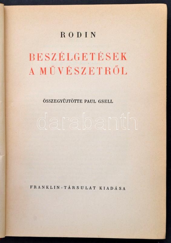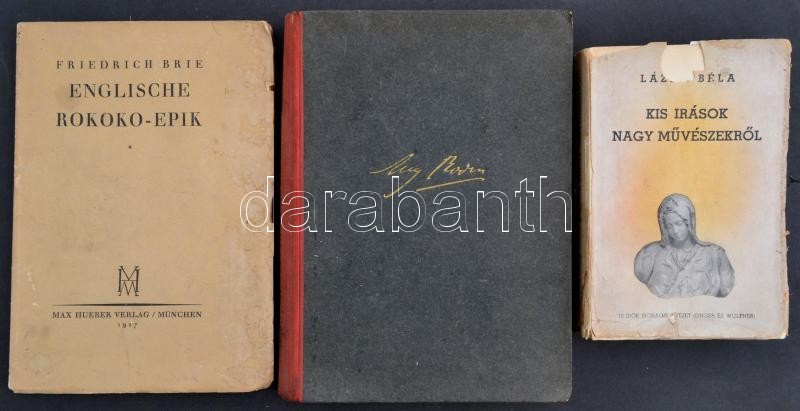 Vegyes művészeti könyvtétel, 3 db: Lázár Béla: Kis írások nagy művészekről. Tanulmányok. Bp., 1942, Singer és Wolfner, 238+2 p. Kiadói papírkötésben, sérült, szakadt borítóval. Rodin: Beszélgetések a művészetről. Összegyűjtötte Paul Gsell. A bevezetést írta Pátzay Pál. Fordította: Farkas Zoltán. Bp.,én.,Franklin. Kiadói kopott félvászon-kötésben. Friedrich Brie: Englishe Rokoko-epik. (1710-1730.) München, 1927, Max Hueber Verlag. Német nyelven. Kiadói papírkötés, felvágatlan, foltos.