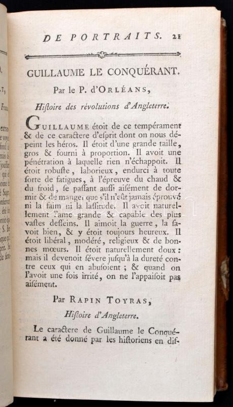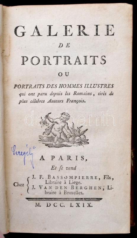[Honoré Lacombe de Prezel]: Galerie de Portraits ou Portraits des hommes illustres qui ont paru depuis les Romains, tirés de plus célebres auteurs françois. Paris, 1769, J. F. Basompierre, J. Van den Berghen, VIII+566+2 p. Francia nyelven. Korabeli aranyozott gerincű egészbőr-kötésben, a borítón kopásnyomokkal, a gerincen sérüléssel.