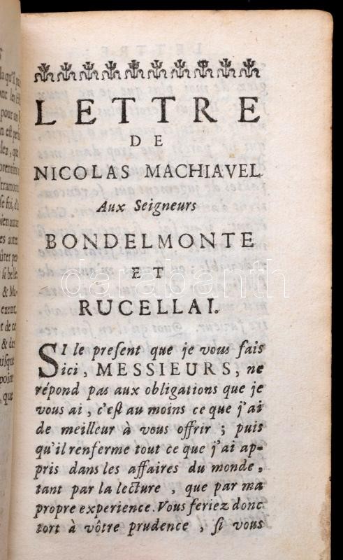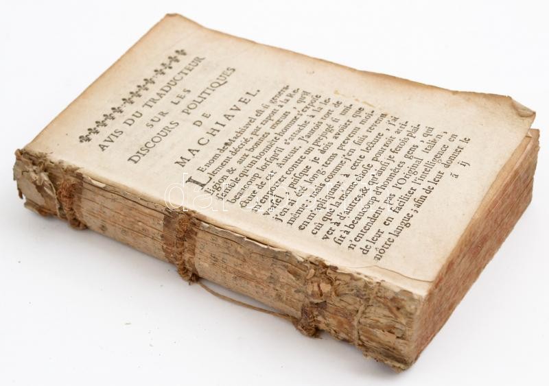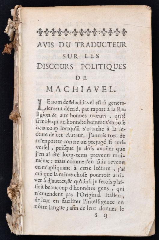[Niccolo Machiavelli]: Discours Politiques de Machiavelli sur Les Decades de Tite-Live. Tome Premier. Amsterdam, 1692, Henri Desbordes, 14 szt. lev.+384 p.+ 1 sztl. lev. Francia nyelven. Borító és címlap hiánnyal, de egyébként jó állapotban.
