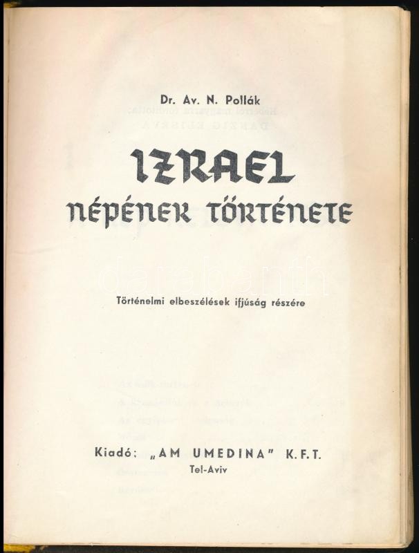Dr. Av. N. Pollák: Izrael népének története. Fordította: Danzig Elisév... https://www.darabanth.com/hu/342-Gyorsarveres/342.0/Konyvek/Konyvek-Judaika~1000013/Dr-Av-N-Pollak-Izrael-nepenek-tortenete-Forditotta-Danzig-Eliseva-Tel-Aviv-e-n-Am~II1929012