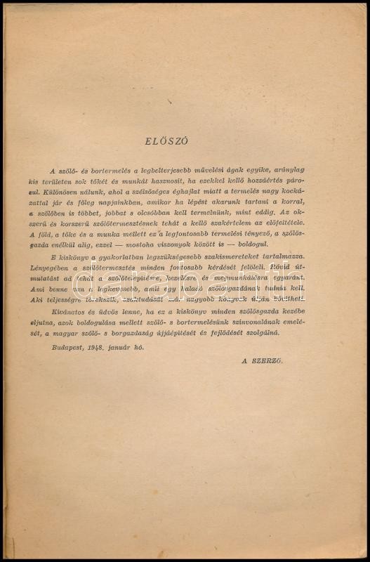 Leírás: Dr. Kosinsky Viktor: A szőlőtermesztés kiskönyve. Bp., 1948, Szerzői kiadás,(Kapucinus-ny.), 65+3 p. Kiadói papírkötés, szakadozott borítóval, sérült, hiányos gerinccel.