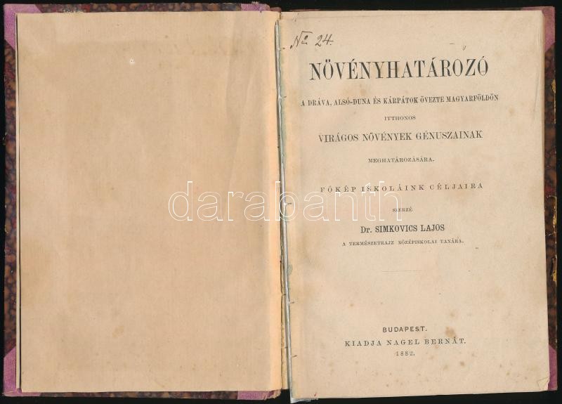 Dr. Simkovics Lajos: Növényhatározó a Dráva, Alsó-Duna, és Kárpátok övezte Magyarföldön. Itthonos virágos növények géniuszainak meghatározására. Főképp iskoláink céljaira. Bp.,1882, Nagel Bernát, VI+155 p. Átkötött félvászon-kötés, kopott borítóval, laza fűzéssel, kis címlaphiánnyal, az első három lap kijár.