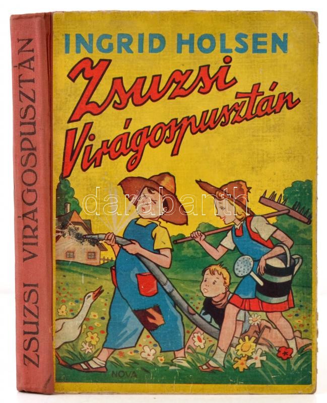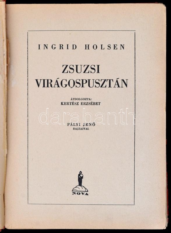 Ingrid Holsen: Zsuzsi Virágospusztán. Átdolgozta Kertész Erzsébet. Pályi Jenő rajzaival. Bp., 1942,Nova. Egészoldalas és szövegközti illusztrációkkal. Kiadói illusztrált félvászon-kötésben, kopottas borítóval, javított gerinccel, de belül jó állapotban.