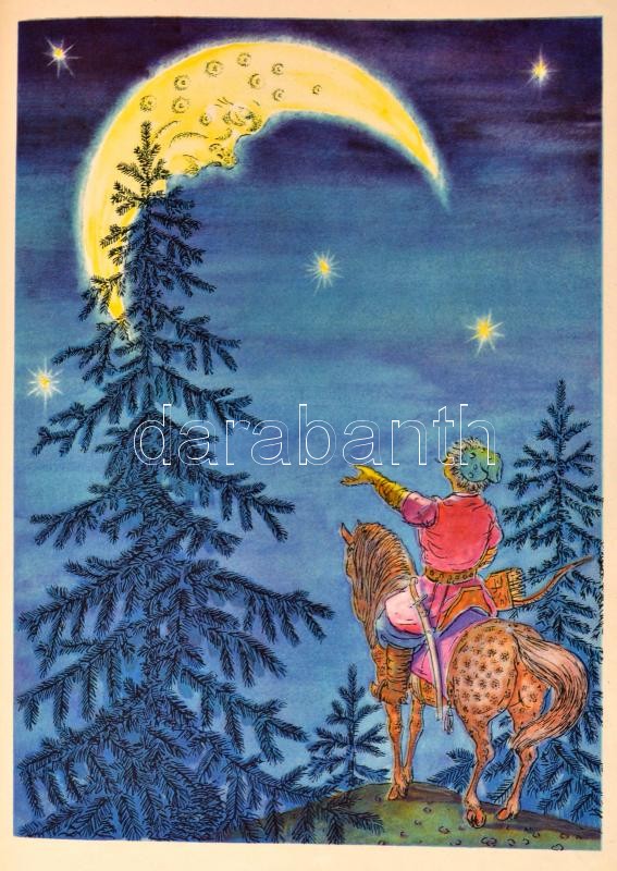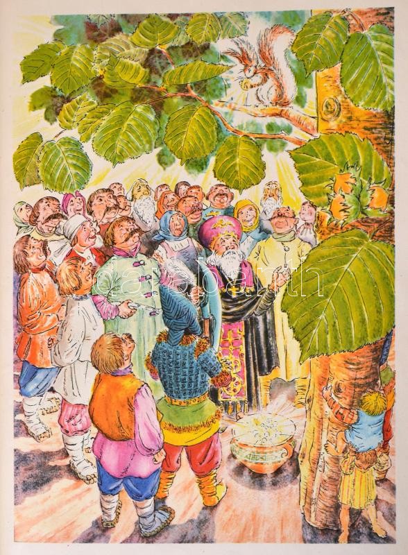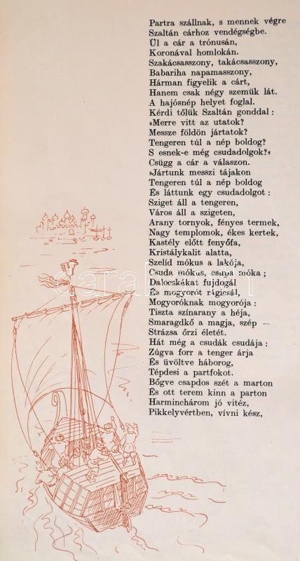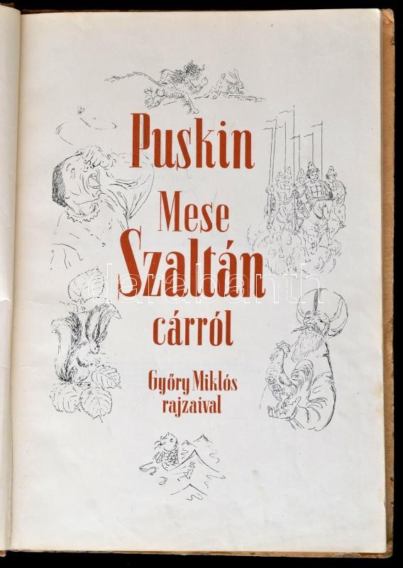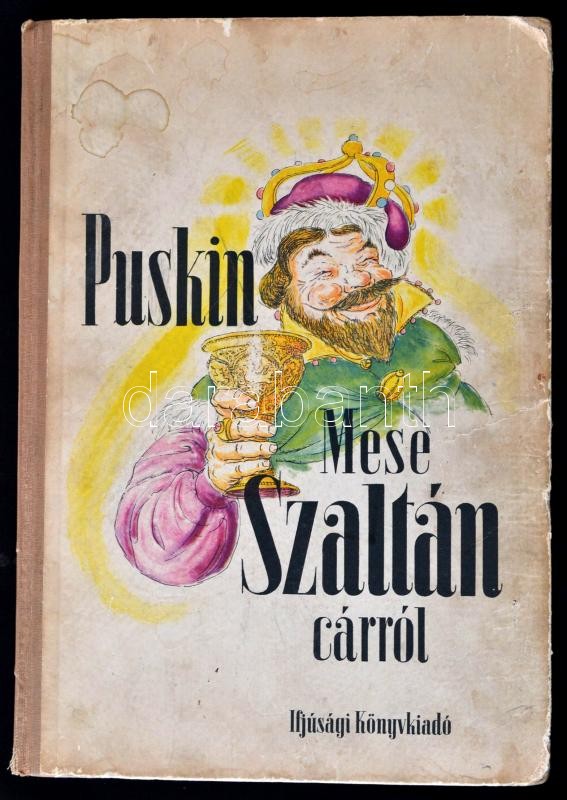 Puskin: Mese Szaltán cárról. Győry Miklós rajzaival. Fordította. Áprily Lajos, Fodor András, Illyés Gyula, Kormos István, Vas István. Bp.,1953, Ifjúsági Könyvkiadó Vállalat. Kiadói illusztrált félvászon-kötés, kopott borítóval, egy egészoldalas illusztráció sérült, kiszínezték, egy oldal szakadt, sérült, pár lapon kisebb szakadásokkal.