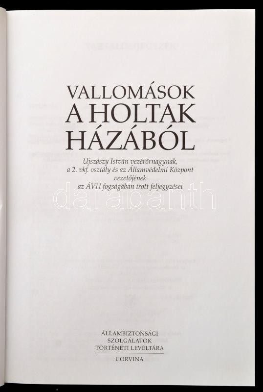 Vallomások a holtak házából. Ujszászy István vezérőrnagynak a 2 vkf. osztály és az Államvédelmi Központ vezetőjének az ÁVH fogságában írott feljegyzései. Bp.,2007, Állambiztonsági Szolgálatok Történeti Levéltára-Corvina. Fekete-fehér fotókkal. Kiadói kartonált papírkötésben, jó állapotban.