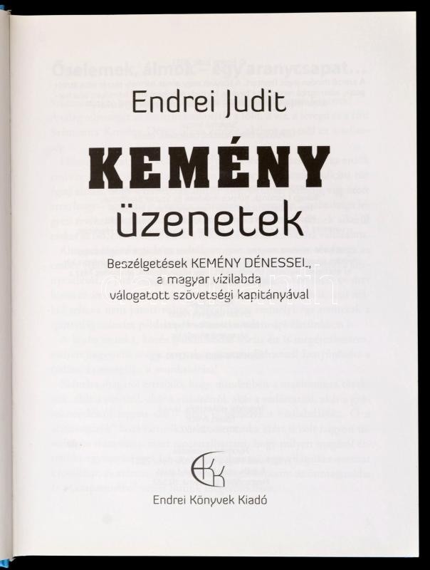 Endrei Judit: Kemény üzenetek. beszélgetések Kemény Dénessel, a magyar vízilabda válogatott szövetségi kapitányával. 2011, Endrei Könyvek Kiadó. Kiadói kartonált kötés, jó állapotban.