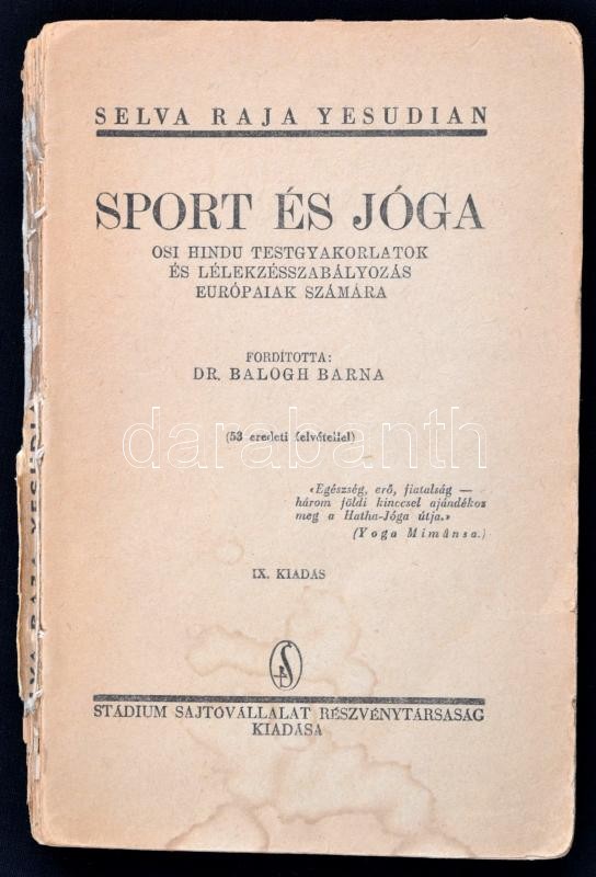 Leírás: Selva Raja Yesudian: Sport és jóga. Bp., 1941. Stádium. Sérült fűzéssel