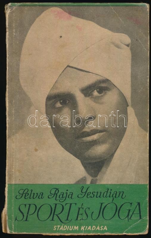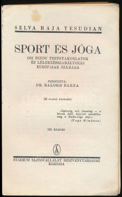 Selva Raja Yesudian: Sport és jóga. Ősi hindu testgyakorlatok és lélekzésszabályozás európaiak számára. Fordította: Dr. Balogh Barna. Bp., é.n.[1942 után],Stádium, 179 p. + 8 tábla. Harmadik kiadás. Kiadói papírkötés, kopott borítóval, szakadt gerinccel, aláhúzásokkal, bejelölésekkel, egy kijáró táblával.