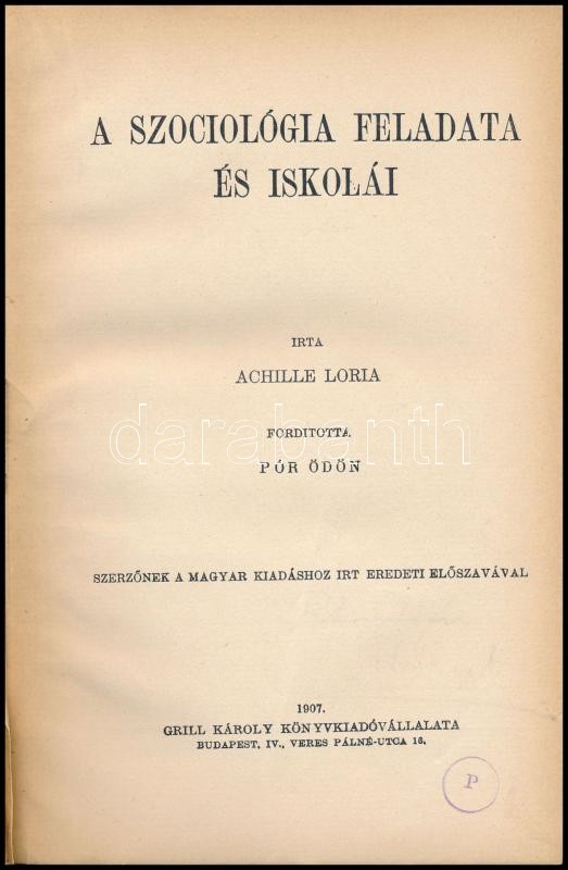 Achille Loria: A szociológia feladatai és iskolái. Fordította: Pór Ödön. Bp.,1907, Grill Károly. Korabeli kissé kopottas egészvászon-kötés, kijáró elülső szennylappal.