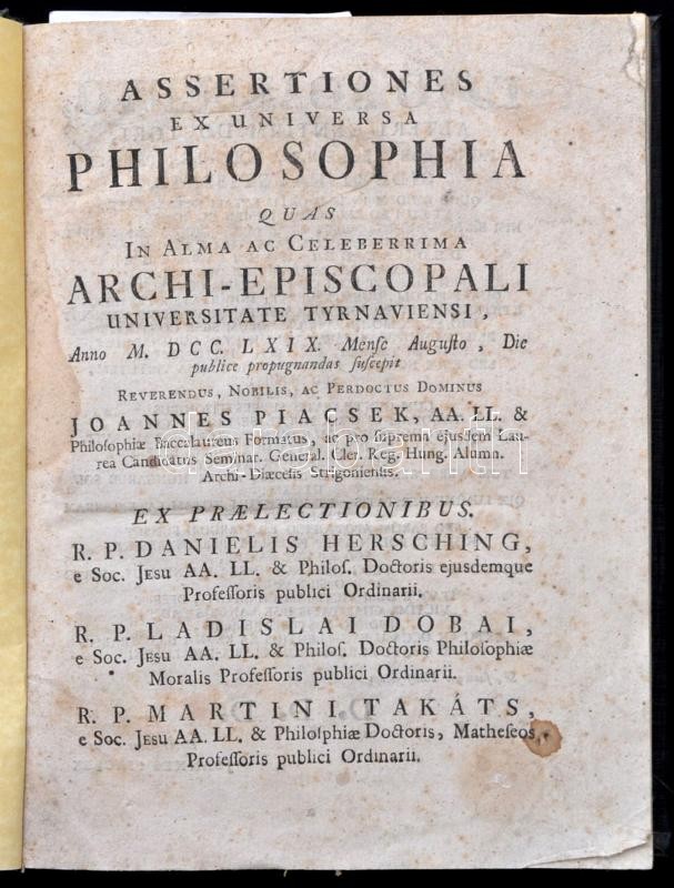 Assertiones ex universa philosophia, quas in alma, ac celeberrima Universitate Tyrnaviensi pro laurea philosophica consequenda anno salutis M. DCC. LXXI. mense Augusto, die [üres hely] publice propugnandas suscepit ... Ferdinandus Stipsics, ... ex praelectionibus ... Joannis Bapt. Horváth, ... Antonii Mailáth, ... Balthasaris Nagy, Nagyszombat, 1771. 302p. Modern egészvászon kötésben.