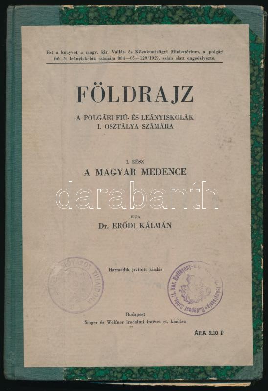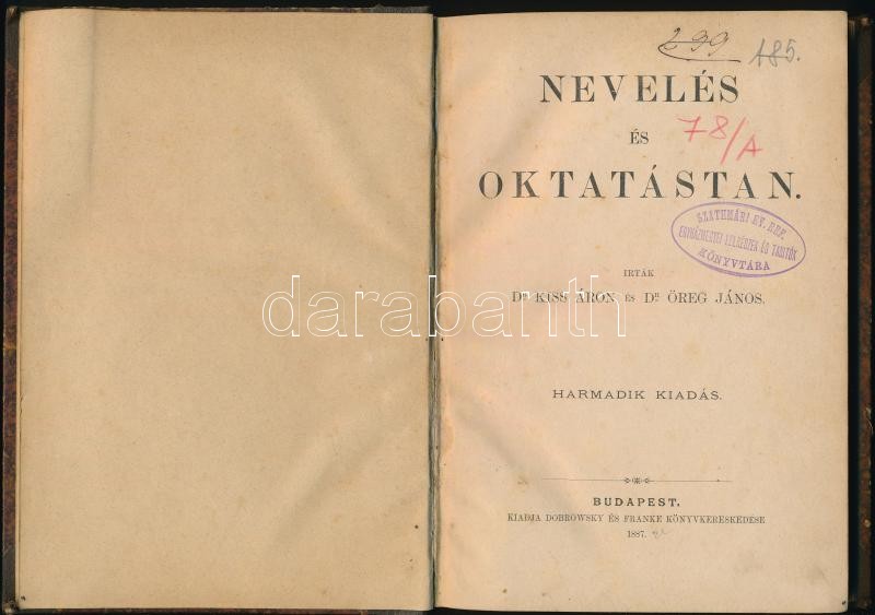 Dr. Kiss Áron-Dr. Öreg János: Nevelés és Oktatástan. Bp., 1887, Dobrowsky és Franke, 184 p. Későbbi átkötött félvászon-kötés, Dávidházi J. könyvkötő kötés (Debrecen), márványozott lapélekkel, intézményi bélyegzőkkel. + Dr. Erődi Kálmán: Földrajz I. rész. : A magyar medence. A polgári fiú és leányiskolák I. osztálya számára. Bp.,é.n.,Singer és Wolfner, 87+1 p. Átkötött kopottas félvászon-kötés, laza fűzéssel, kijáró lapokkal, intézményi bélyegzővel.