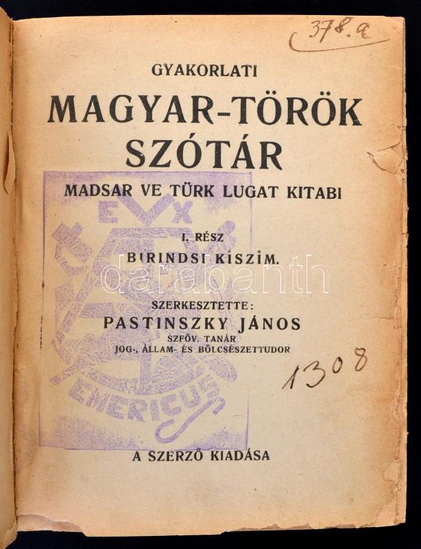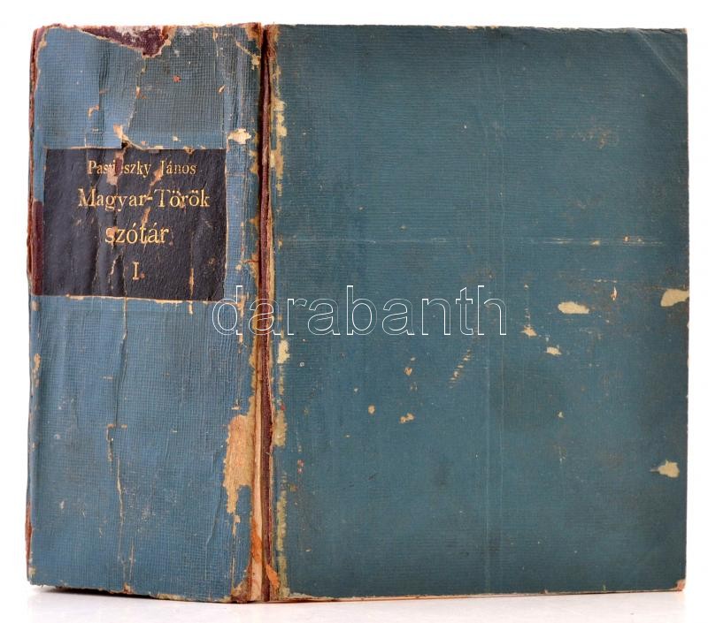 Gyakorlati Magyar-Török Szótár. Madsar Ve Türk Lugat Kitabi. I. rész Brindsi Kiszim. Szerk. Pastinszky János. Bp., (1922), Szerzői kiadás. Átkötött amatőr kartonált-kötés, megviselt állapotban, sérült gerinccel, néhány kijáró lappal, 1362-1375 oldal között hiánnyal. Több kötet nem jelent meg, érdekes ex libris bélyegzővel a címlapon. Ritka!