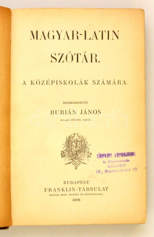 Magyar-latin szótár a középiskolák számára. Szerk.: Burián János. Bp.,1899, Franklin. Kiadói aranyozott gerincű egészvászon-kötés, kopott borítóval, a gerincen kis sérüléssel.