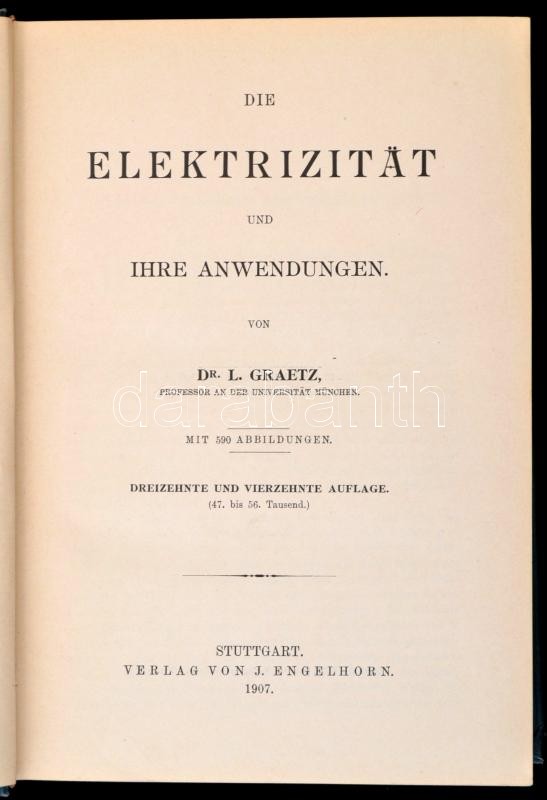 Dr. L. Graetz: Die Elektrizität und ihre Anwendungen. Stuttgart, 1907, J. Engelhorn. Szövegközti ábrákkal, német nyelven. Kiadói aranyozott egészvászon-kötés, kissé kopott borítóval./Linen-binding, with little bit worn cover, in German language.