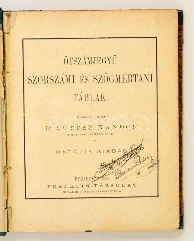 Leírás: Ötszámjegyü szorszámi és szögmértani táblák. Összeállította: Lutter Nándor. 3. kiadás.