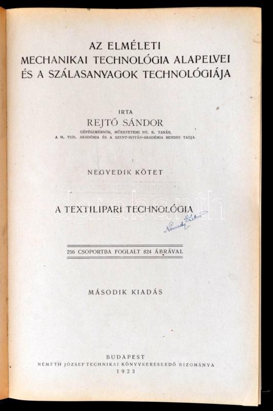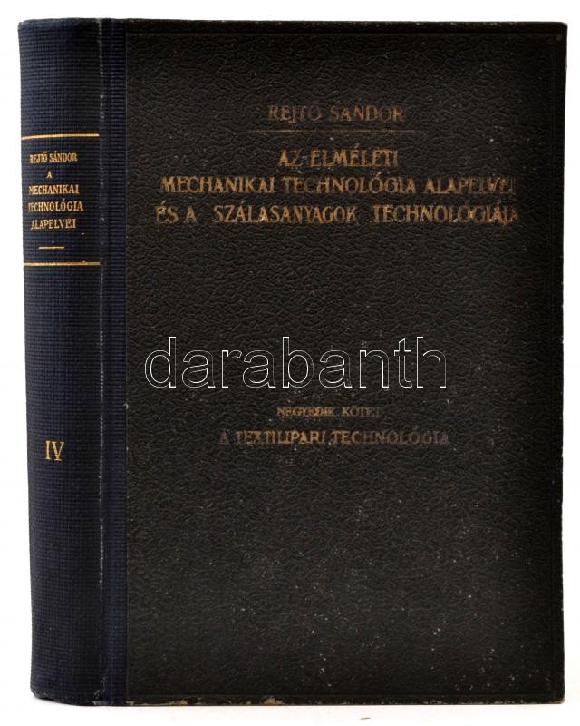 Rejtő Sándor: Az elméleti mechanikai technológia alapelvei és a szálasanyagok technológiája IV. kötet: A textilipari technológia. Bp.,1923, Németh József Technikai Könyvkereskedése. Második kiadás. Kiadói aranyozott félvászon-kötésben, kissé kopott borítóval.