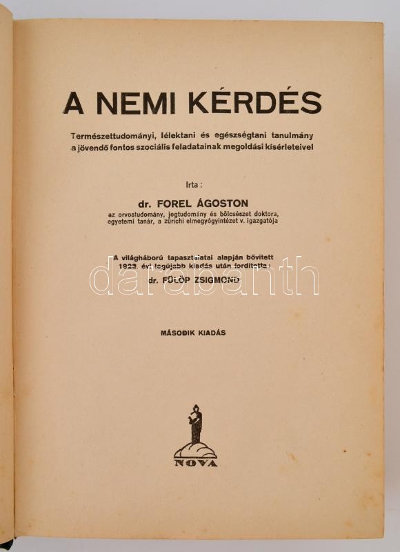 Dr. Forel Ágoston: A nemi kérdés. Természettudományi, lélektani és egészségtani tanulmány a jövendő fontos szociális feladatainak megoldási kísérleteivel. Bp., 1926, Nova. Kiadói egészvászon kötés, kissé kopottas állapotban.