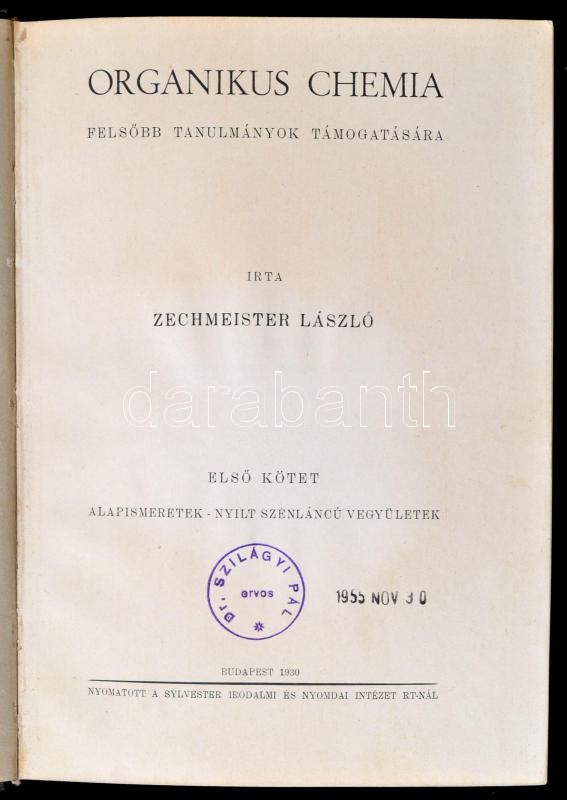 Dr. Zechmeister László: Organikus chemia felsőbb tanulmányok támogatására. I-II. kötet. (Egyben.) I. kötet: Alapismeretek - Nyílt szénláncú vegyületek. II. kötet: Gyűrűs és ismeretlen szerkezetű anyagok. Bp.,1930-1932, Sylvester Irodalmi és Nyomdai Intézet Rt., XII+578 p. Átkötött kopott egészvászon-kötés, kissé sérült gerinccel, az alsó lapélek foltosak.