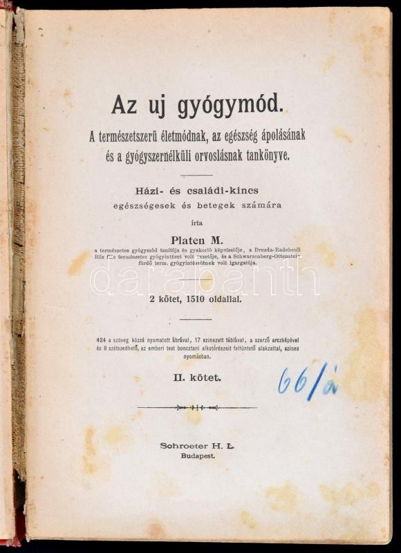 Platen M(oritz): Az új gyógymód. II. kötet. Bp.,én., Schroeter H. L. Színes táblákkal, mellékletekkel. Javított gerincű egészvászon-kötés, kopott borítóval, kissé foltos lapokkal.